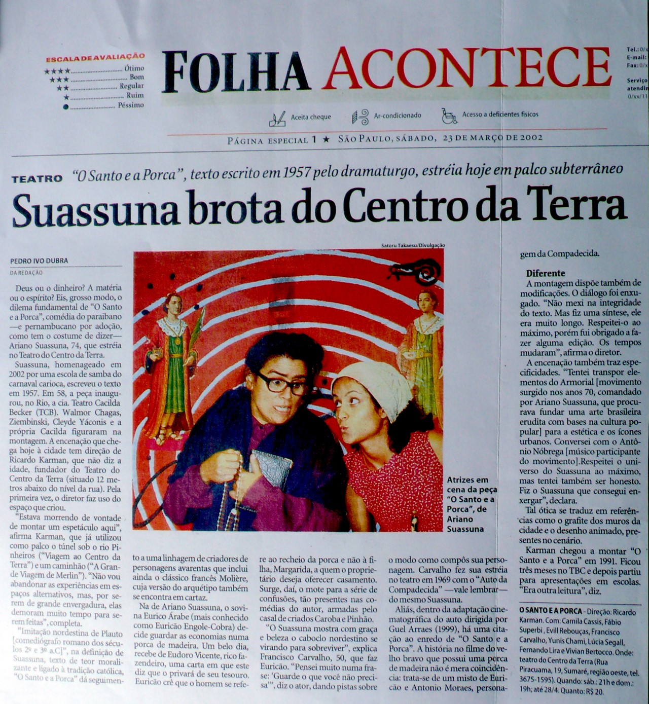1991 e 2002Um dos mais importantes escritores brasileiros, Ariano Suassuna (1927-2014) andava meio esquecido quando o diretor Ricardo Karman decidiu levar aos palcos a peça que, assim como outras do repertório do romancista e poeta paraibano, costumava ser encenada apenas por grupos amadores. A primeira encenação de O Santo e a Porca (1958), assinada por Ziembinski, havia se tornado histórica. Reuniu no elenco nomes fundamentais do teatro nacional, como Cacilda Becker, Cleide Yáconis e Walmor Chagas, entre outros.