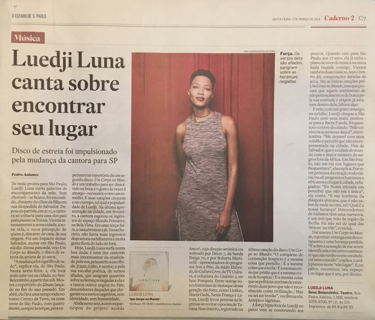 "A força hipnótica de Luedji no palco vem se construindo aos poucos. Quando veio para São Paulo, aos 27 anos, ela já tinha o plano de viver de música na única mala trazida consigo. Vieram também duas músicas, Asas e Dentro Ali, composições datadas de 2012. São as únicas canções pré-Um Corpo no Mundo, mas que provam que aquele sentimento de não pertencimento e de busca pela sua essência e origem já estavam dentro dela, faltava algo.